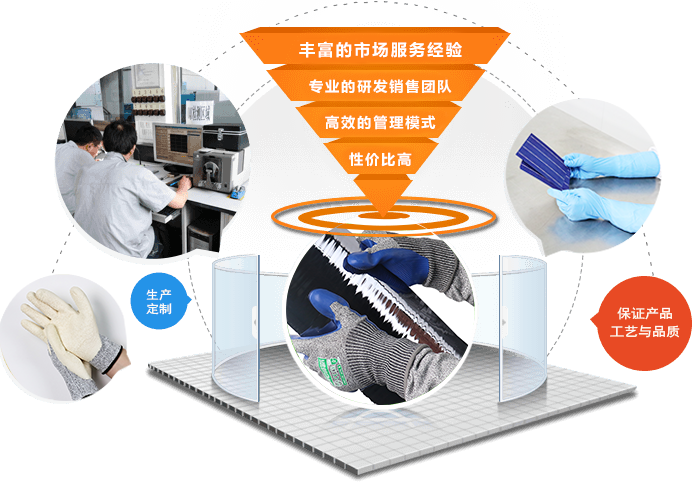 手套芯采用凱夫拉材質,經權威機構檢測屬于5級防割標準,針織采用無縫針織,針織密度高,防止硅粉及金屬碎屑進入手背,手掌涂層采用壓紋設計,具有良好的減震功能,手套制作完成以后經過6次清洗工藝處理,經權威機構檢測表金屬雜質低于45PPBW.